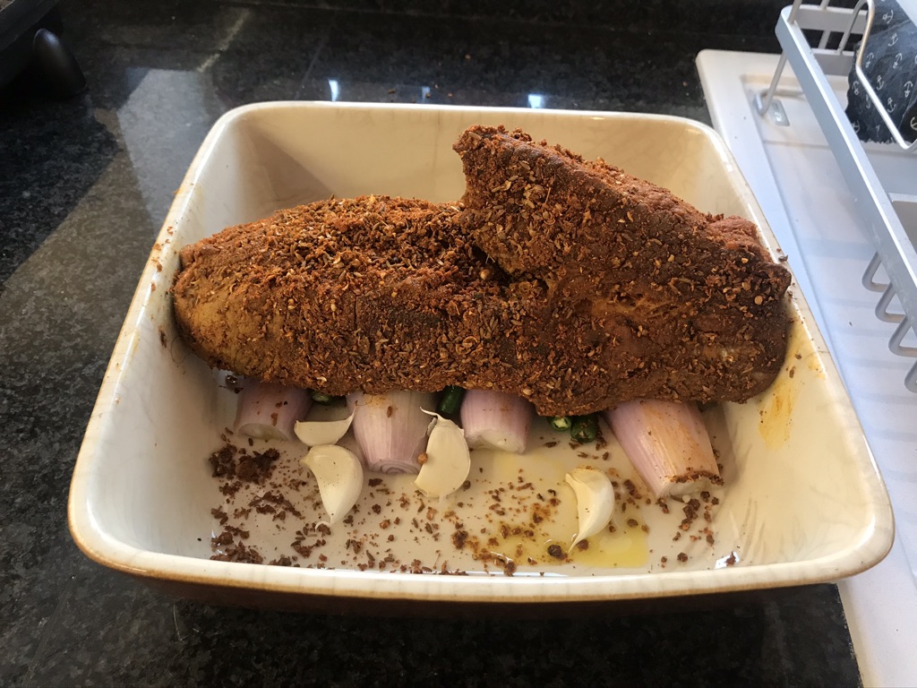 - Place the dish in the oven for 20 mins to allow the spices in the rub to toast a bit and brown. Remove the tray from the oven. Reduce the oven temperature to 140oC.